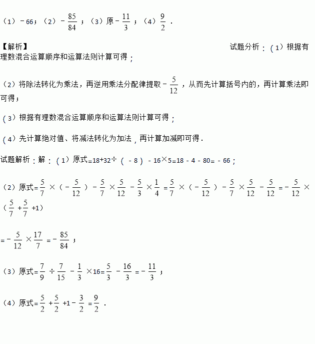 (1)18+32÷(﹣2)3﹣(﹣4)2×5