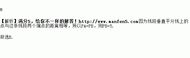 如图,直线CD是线段AB的垂直平分线,P为直线CD上的一点,已知线段PA=5,则线段PB的长度为( )