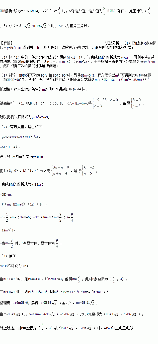 (2)点P为线段MB上一个动点,过点P作PD⊥x轴于点D.若OD=m,△PCD的面积为S,试判断S有最大值或最小值?并说明理由;