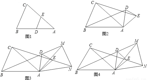 ÈçͼËùʾ£¬ÔÚ¡÷ABCÖУ¬D¡¢E·Ö±ðÊÇAB¡¢ACÉϵĵ㣬DE¡ÎBC£¬Èçͼ¢Ù£¬È»ºó½«¡÷ADEÈÆAµã˳ʱÕëÐýתһ¶¨½Ç¶È£¬µÃµ½Í¼¢Ú£¬È»ºó½«BD¡¢CE·Ö±ðÑÓ³¤ÖÁM¡¢N£¬Ê¹DM=£¨1£©ÈôAB=AC£¬Çë̽¾¿ÏÂÁÐÊýÁ¿¹ØÏµ£º