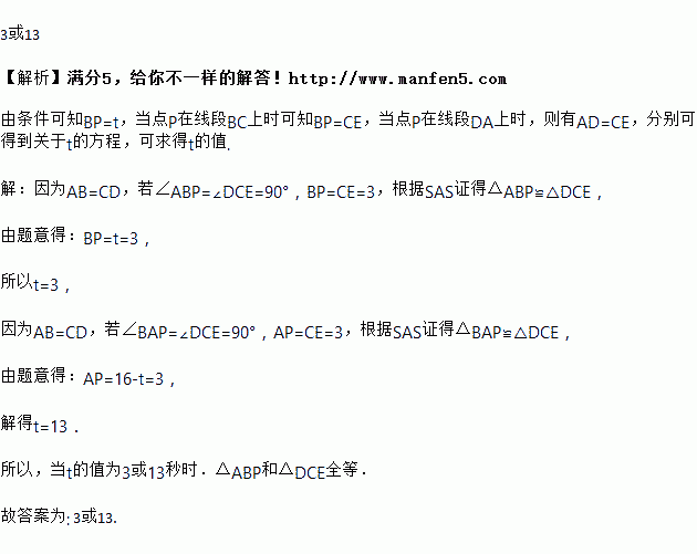 已知:如图,在长方形ABCD中,AB=4,AD=6.延长BC到点E,使CE=3,连接DE,动点P从点B出发,以每秒1个单位的速度沿BC﹣CD﹣DA向终点A运动,设点P的运动时间为t秒,当t的值为__________秒时.△ABP和△DCE全等.