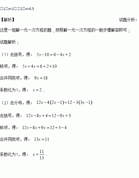 ⑴5(x-2)=6-2(2x-1) ⑵ x-