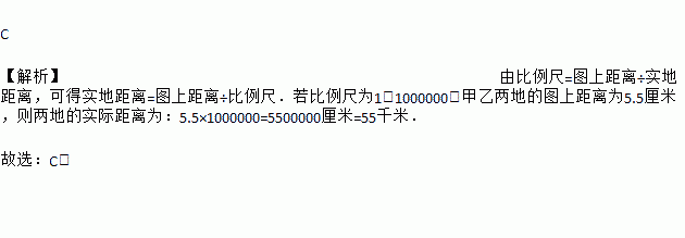 C 【解析】由比例尺=图上距离÷实地距离,可得实地距离=图上距离÷比例尺.若比例尺为1:1000000,甲乙两地的图上距离为5.5厘米,则两地的实际距离为:5.5×1000000=5500000厘米=55千米. 故选:C.