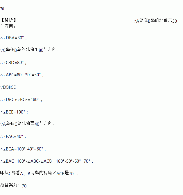 如图,A岛在B岛的北偏东方向,C岛在B岛的北偏东方向,A岛在C岛北偏西方向,从A岛看两岛的视角是______ 度