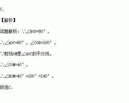 如图,两条直线AB,CD交于点0,射线OM是∠AOC的平分线,若∠BOD=80°,则∠BOM等于( )