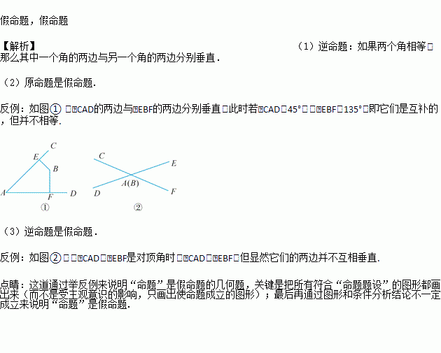 写出命题“如果一个角的两边与另一个角的两边分别垂直,那么这两个角相等”的逆命题,并判断原命题和逆命题的真假.若是假命题,请举出反例.