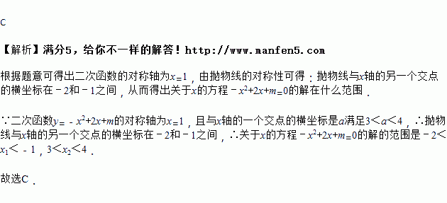 已知二次函数y=﹣x2+2x+m的图象与x轴的一个交点的横坐标是a,且3<a<4,则关于x的方程﹣x2+2x+m=0的解在什么范围内( )