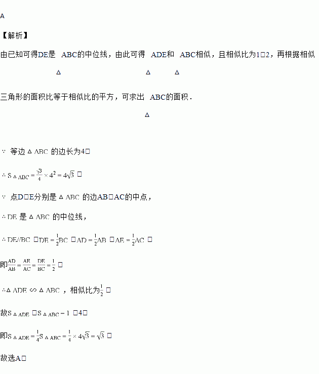如图,边长为4的等边中,D、E分别为AB,AC的中点,则![]()