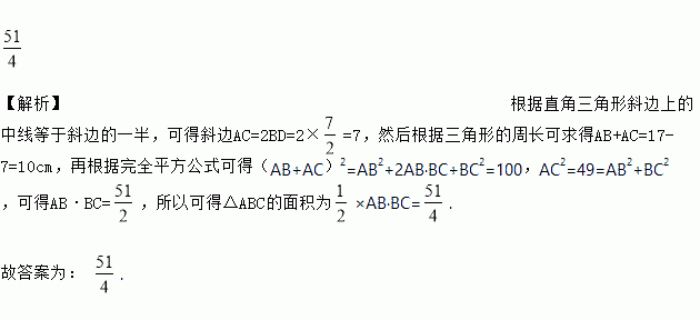 如图,已知Rt△ABC中,∠ABC=90°,△ABC的周长为17cm,斜边上中线BD长为.则该三角形的面积为______.