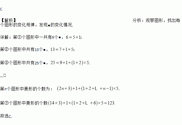 下列图形都是由同样大小的●和○按照一定规律组成的,其中第①个图中共有6个●,第②个图中共有13个●,第③个图中共有25个●,第④个图中共有42个●,…,照此规律排列下去,则第⑦个图中●的个数为( )