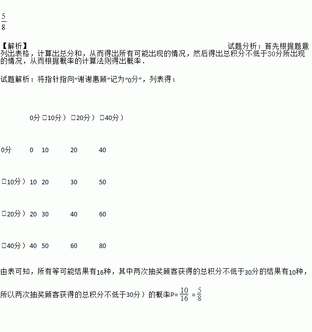 ¡°ÎåÒ»¡±¼ÙÈÕÆÚ¼ä£¬Ä³ÍøµêΪÁË´ÙÏú£¬Éè¼ÆÁËÒ»Öֳ齱ËÍ»ý·Ö»î¶¯£¬ÔÚ¸ÃÍøµêÍøÒ³ÉÏÏÔʾÈçͼËùʾµÄÔ²ÐÎתÅÌ£¬×ªÅ̱»¾ùµÈµÄ·Ö³ÉËÄ·Ý£¬ËĸöÉÈÐÎÉÏ·Ö±ð±êÓС°Ð»Ð»»Ý¹Ë¡±¡¢¡°10·Ö¡±¡¢¡°20·Ö¡±¡¢¡°40·Ö¡±×ÖÑù£®²ÎÓë³é½±µÄ¹Ë¿ÍÖ»ÐèÓÃÊó±êµã»÷תÅÌ£¬Ö¸Õë¾Í»áÔÚת¶¯µÄ¹ý³ÌÖÐËæ»úµÄÍ£ÔÚij¸öÉÈÐÎÇøÓò£¬Ö¸ÕëÖ¸ÏòÉÈÐÎÉϵĻý·Ö¾ÍÊǹ˿ͻñµÃµÄ½±Àø»ý·Ö£¬·²ÊÇÔڻÆÚ¼äϵ¥µÄ¹Ë¿Í£¬¾ù¿É»ñµÃÁ½´Î³é½±»ú»á£¬ÇóÁ½´Î³é½±¹Ë¿Í»ñµÃµÄ×Ü»ý·Ö²»µÍÓÚ30·ÖµÄ¸ÅÂÊ£®