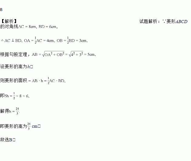 如图,菱形ABCD的对角线交于点O,AC=8cm,BD=6cm,则菱形的高为( )