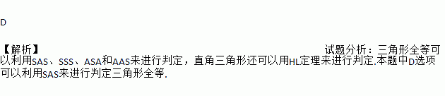 D 【解析】试题分析:三角形全等可以利用SAS、SSS、ASA和AAS来进行判定,直角三角形还可以用HL定理来进行判定.本题中D选项可以利用SAS来进行判定三角形全等.