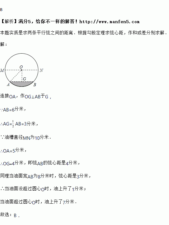 在圆柱形油槽内装有一些油,截面如图所示,直径MN为100cm,油面宽AB为60cm,如果再注入一些油后,油面宽变为80cm,则油面上升( )