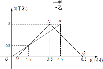 甲、乙两车从A地将一批物品匀速运往B地,已知甲出发0.5h后乙开始出发,如图,线段OP、MN分别表示甲、乙两车离A地的距离S(km)与时间t(h)的关系,请结合图中的信息解决如下问题: