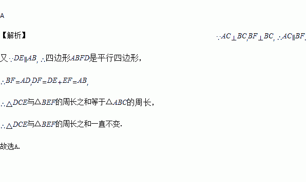 如图,在Rt△ABC中,∠C=90°,点D是AC边上的动点,过点D作DE∥AB交CB于E,过点B作BF⊥BC交DE的延长线于F,当AD从小于DC到大于DC的变化过程中,则△DCE与△BEF的周长之和的变化情况是( )
