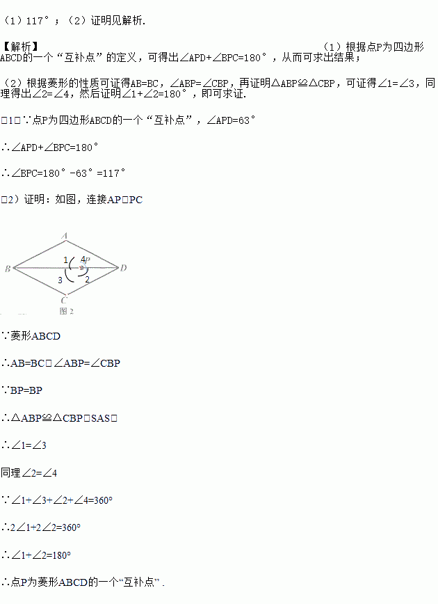 (1)如图1,点P为四边形ABCD的一个“互补点”,∠APD=63°,求∠BPC的度数.