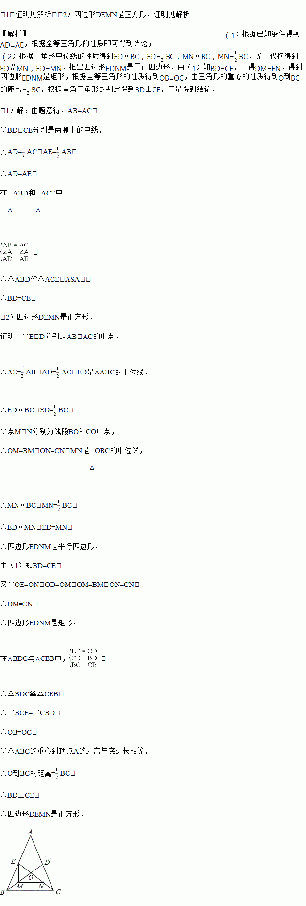(2)设BD与CE相交于点O,点M,N分别为线段BO和CO的中点,当△ABC的重心到顶点A的距离与底边长相等时,判断四边形DEMN的形状,无需说明理由.