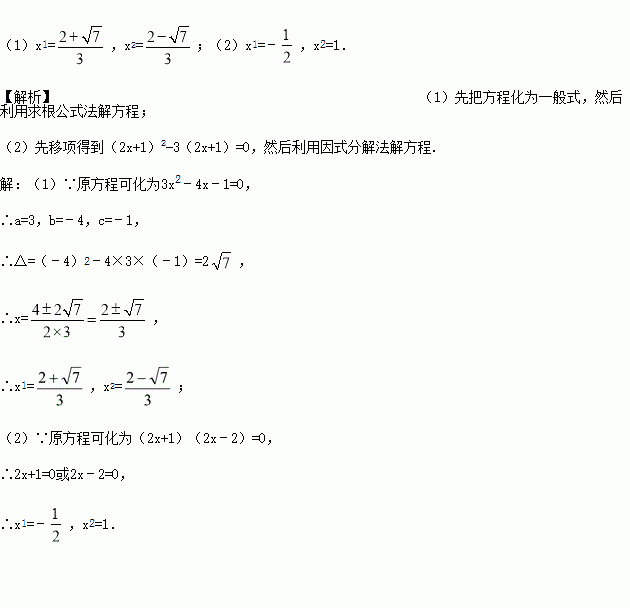 (1)3x2﹣1=4x (2)(2x+1)2=3(2x+1)