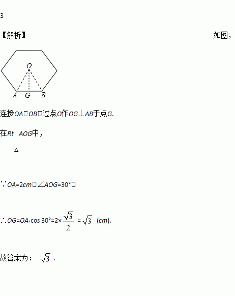 已知正六边形的半径为2cm,那么这个正六边形的边心距为 ________cm