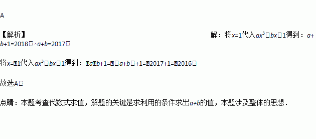 已知当x=1时,代数式ax3+bx+1的值为2018,则当x=-1时,代数式ax3+bx+1的值为( )