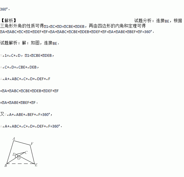 (10分) 如图所示,求∠A+∠B+∠C+∠D+∠E+∠F的度数.