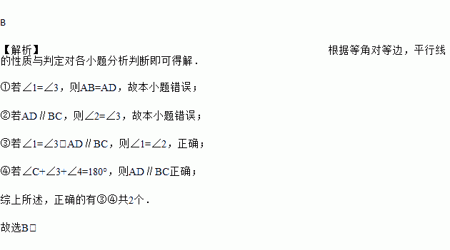 ③若∠1=∠3,AD∥BC,则∠1=∠2;④若∠C+∠3+∠4=180°,则 AD∥BC.