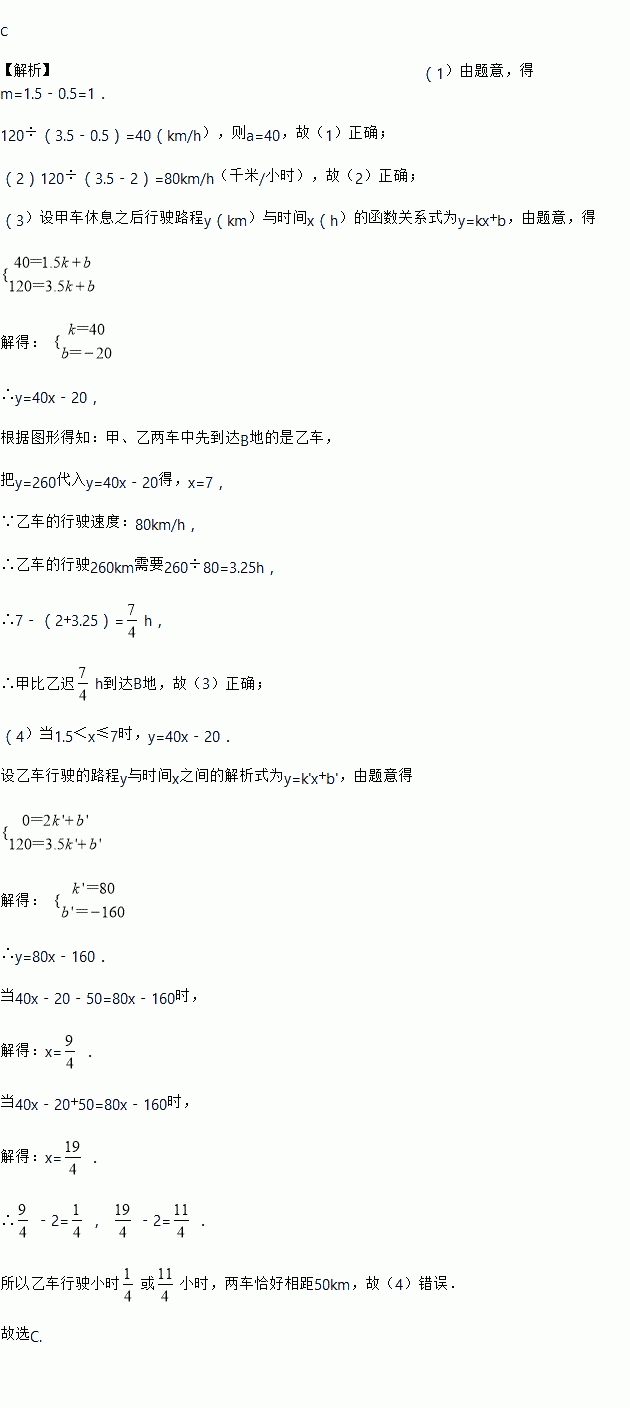 甲、乙两车从A地驶向B地,并以各自的速度匀速行驶,甲车比乙车早行驶2h,并且甲车途中休息了0.5h,如图是甲乙两车行驶的距离y(km)与时间x(h)的函数图象.则下列结论: