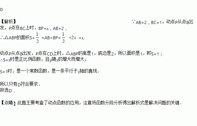 如图,在长方形ABCD中,AB=CD=2,BC=AD=1,动点P从点B出发,沿路线B→C→D做匀速运动,那么△ABP的面积S与点P运动的路程x之间的函数图象大致为( )