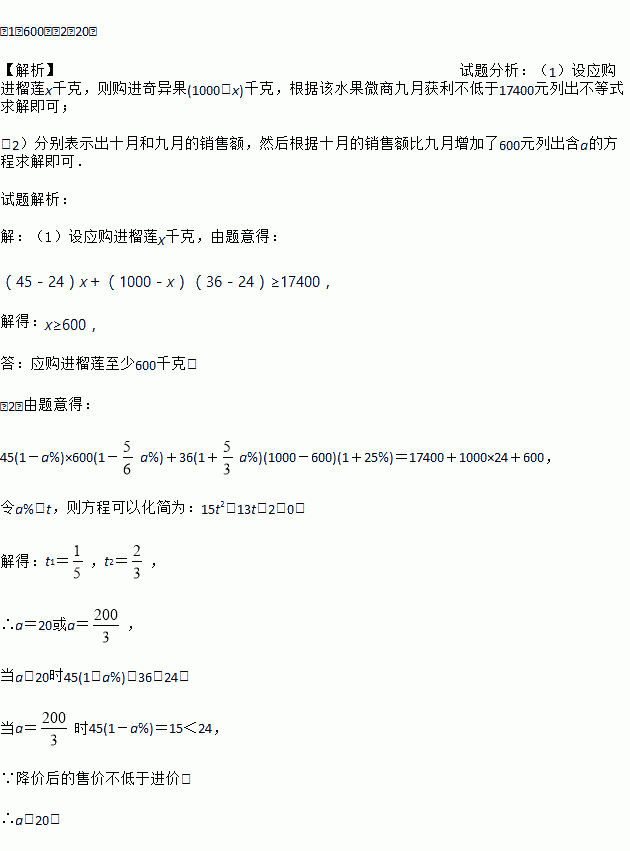 (1)某水果微商今年九月购进榴莲和奇异果共1000千克,它们的进价均为每千克24 元,然后以榴莲售价每千克45元,奇异果售价每千克36元的价格很快销售完,若该水果微商九月获利不低于17400元,求应购进榴莲至少多少千克?