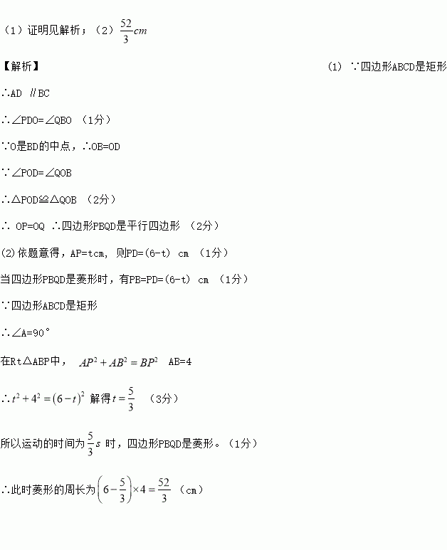 (2) 若AD=6cm,AB=4cm, 点P从点A出发,以1cm/s的速度向点D运动(不与点D重合),设点P运动时间为t s , 请用含t的代数式表示PD的长,并求出当t为何值时,四边形PBQD是菱形。并求出此时菱形的周长。