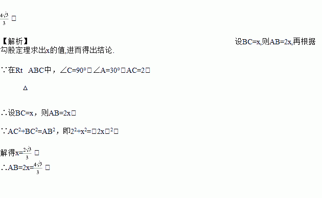 如图,在Rt△ABC中,∠C=90°,∠A=30°,AC=2求斜边AB的长.