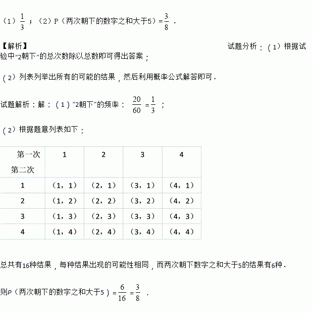 如图,均匀的正四面体的各面依次标有1,2,3,4四个数字,小明做了60次投掷试验,结果统计如下: