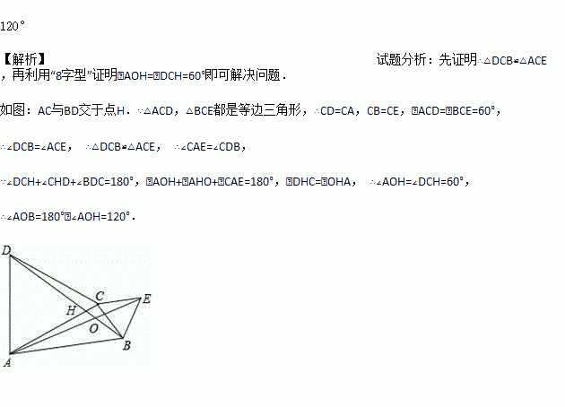 如图,在△ABC中,分别以AC、BC为边作等边三角形ACD和等边三角形BCE,连接AE、BD交于点O,则∠AOB的度数为________。