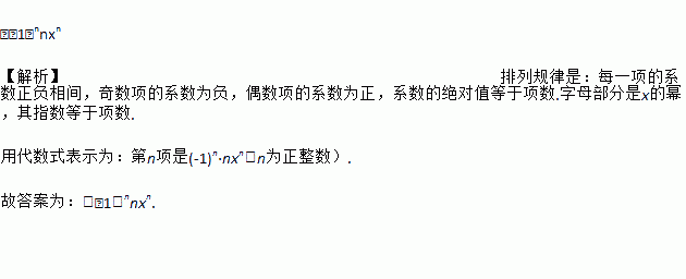 (﹣1)nnxn 【解析】排列规律是:每一项的系数正负相间,奇数项的系数为负,偶数项的系数为正,系数的绝对值等于项数.字母部分是x的幂,其指数等于项数. 用代数式表示为:第n项是(-1)n·nxn(n为正整数). 故答案为:(﹣1)nnxn.