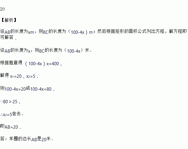 如图,要利用一面墙(墙长为米)建羊圈,用米的围栏围成总面积为平方米的三个大小相同的矩形羊圈,则羊圈的边长为________米.