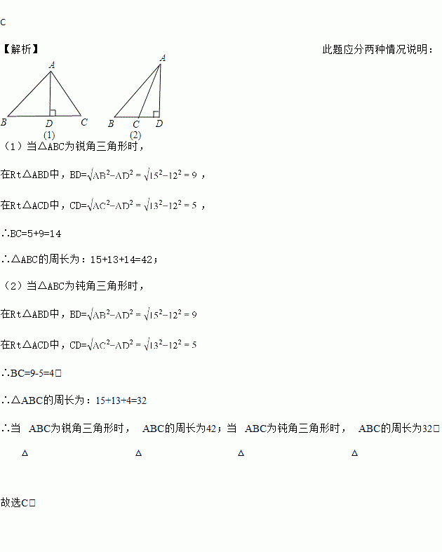 在△ABC中,AB=15,AC=13,高AD=12,则△ABC的周长为( )