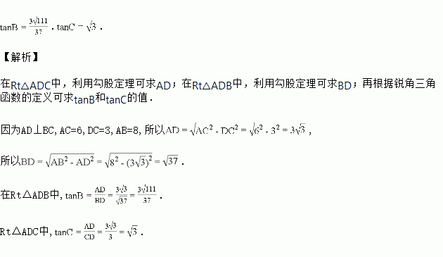 如图所示,在△ABC中,AC=6,AB=8,AD⊥BC于D,DC=3,求tanB,tanC的值.