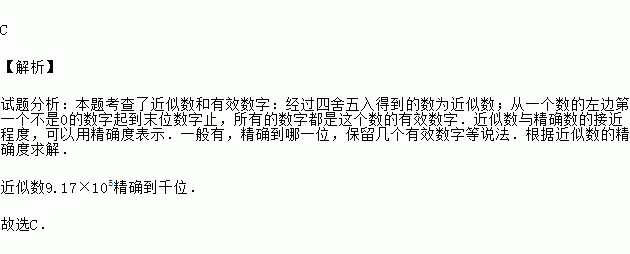 C 【解析】 试题分析:本题考查了近似数和有效数字:经过四舍五入得到的数为近似数;从一个数的左边第一个不是0的数字起到末位数字止,所有的数字都是这个数的有效数字.近似数与精确数的接近程度,可以用精确度表示.一般有,精确到哪一位,保留几个有效数字等说法.根据近似数的精确度求解. 近似数9.17×105精确到千位. 故选C.