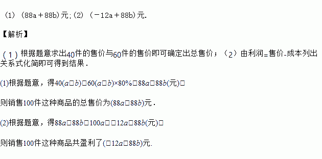某商店有一种商品,每件成本a元,原来按成本增加b元定出售价,售价40件后,由于库存积压减价,按售价的80%出售,又销售60件.