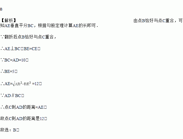 如图,?ABCD中,AB=13,AD=10,将?ABCD沿AE翻折后,点B恰好与点C重合,则点C到AD的距离为( )
