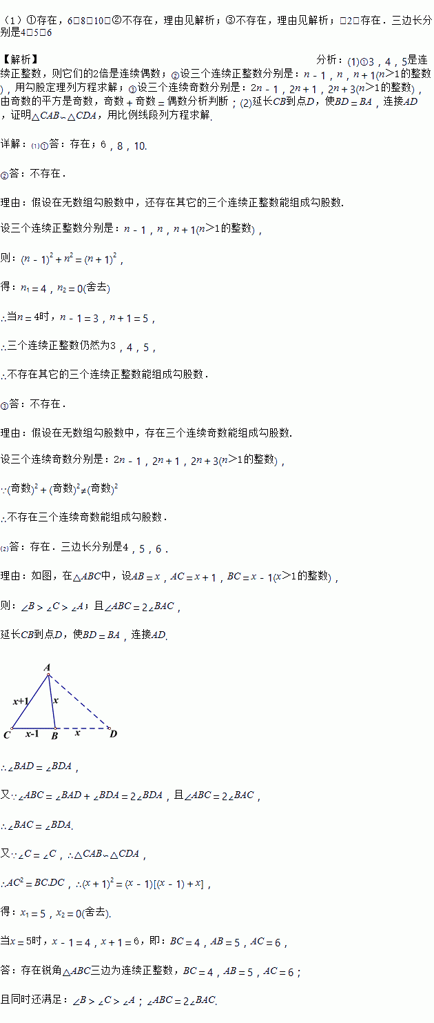⑵ 探索升华:是否存在锐角△ABC三边也为连续正整数;且同时还满足:∠B>∠C>∠A;∠ABC=2∠BAC?若存在,求出△ABC三边的长;若不存在,说明理由.