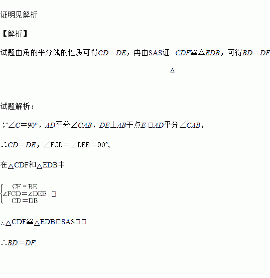 如图,在△ABC中,∠C=90°,AD平分∠CAB,DE⊥AB于点E,点F在AC上,BE=FC.求证:BD=DF.