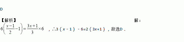 D 【解析】【解析】 ,∴3(x﹣1)﹣6=2(3x+1),故选D.
