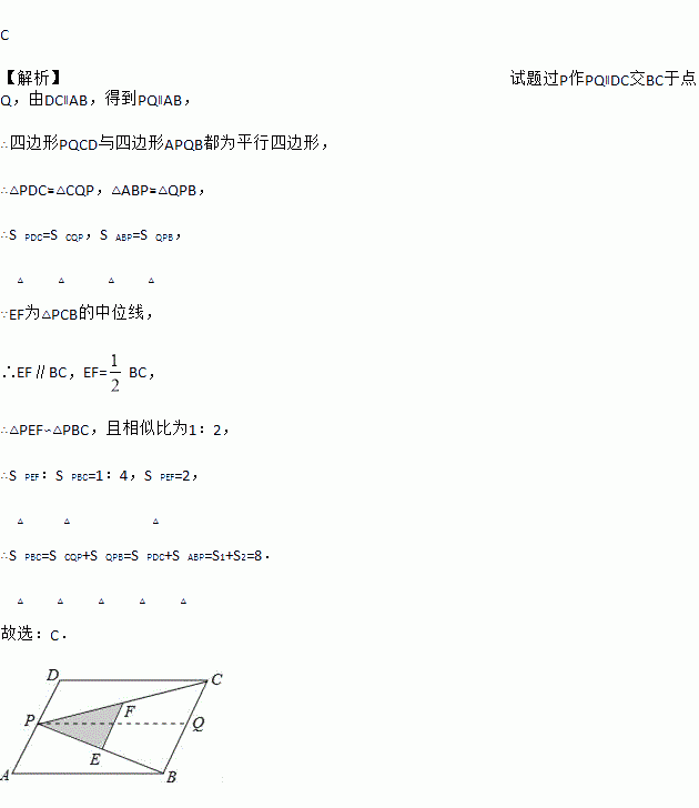 如图,P为平行四边形ABCD边AD上一点,E、F分别为PB、PC的中点,△PEF、△PDC、△PAB的面积分别为S、S1、S2,若S=2,则S1+S2=( )