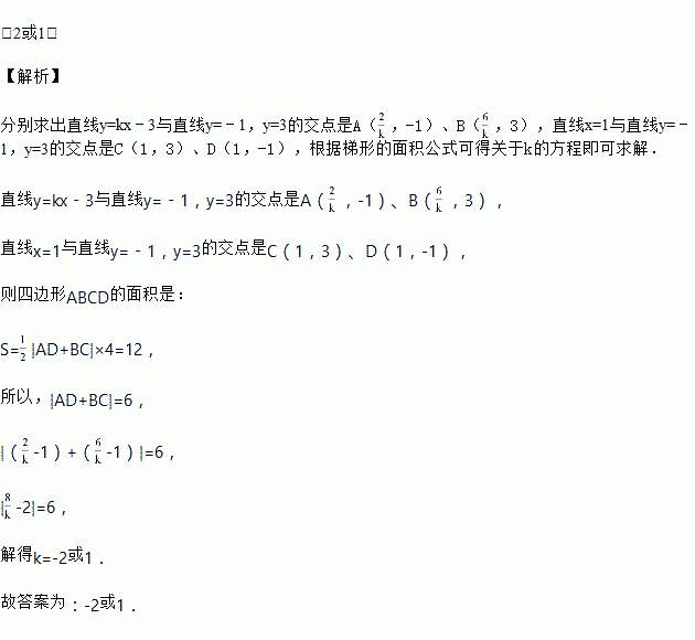 若四条直线x=1,y=﹣1,y=3,y=kx﹣3所围成的凸四边形的面积等于12,则k的值为________