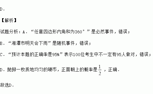 D.抛掷一枚质地均匀的硬币,正面朝上的概率是![]()