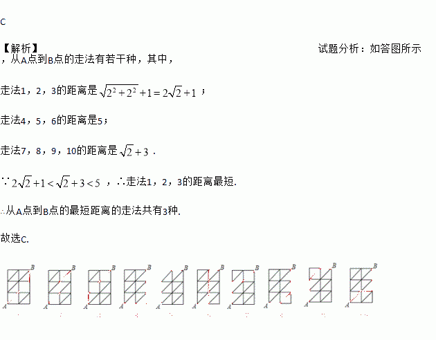 C 【解析】试题分析:如答图所示,从A点到B点的走法有若干种,其中, 走法1,2,3的距离是; 走法4,5,6的距离是5; 走法7,8,9,10的距离是. ∵,∴走法1,2,3的距离最短. ∴从A点到B点的最短距离的走法共有3种. 故选C.