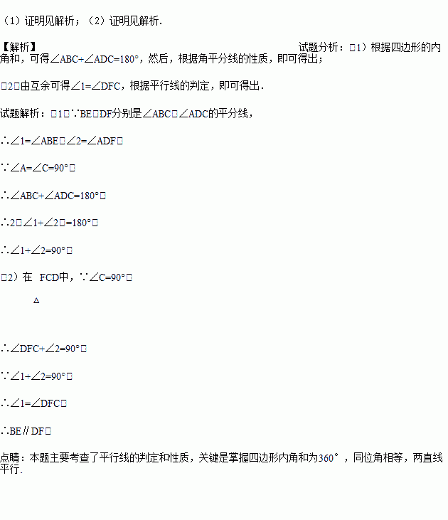 四边形ABCD中,∠A=∠C=90°,BE、DF分别是∠ABC、∠ADC的平分线.求证: