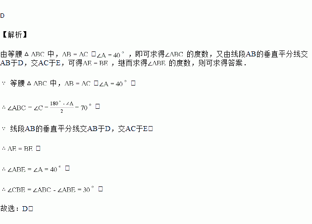 如图,在△ABC中,AB=AC,∠A=40°,AB的垂直平分线交AB于点D,交AC于点E,连接BE,则∠CBE的度数为( )